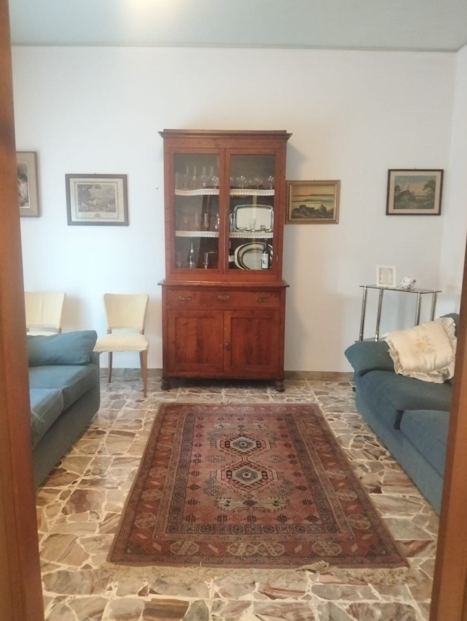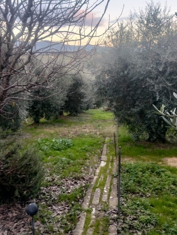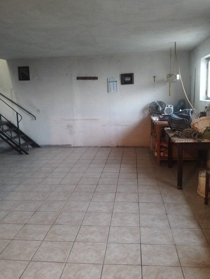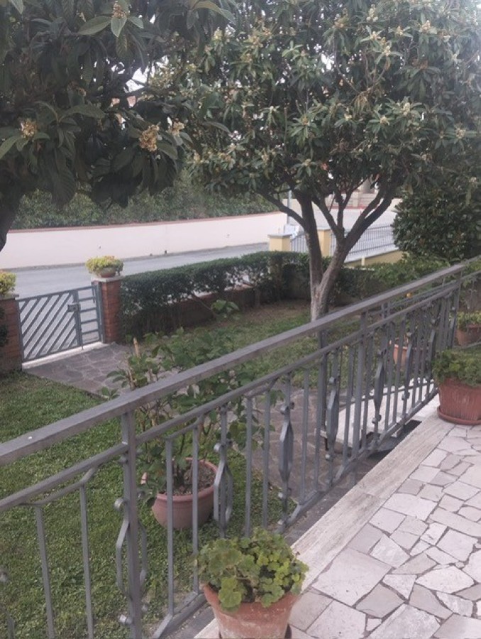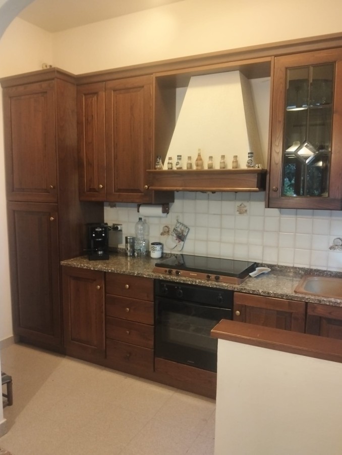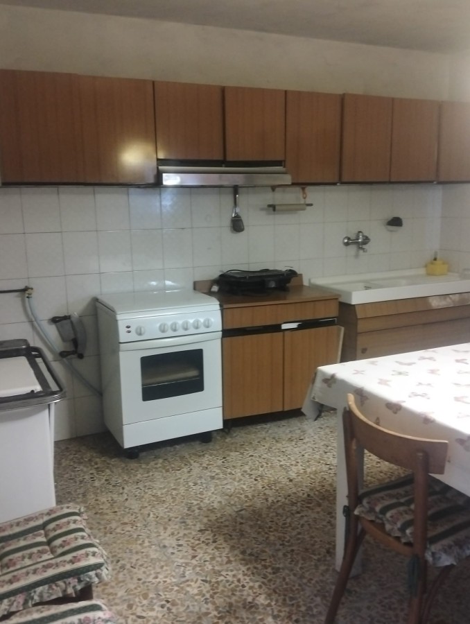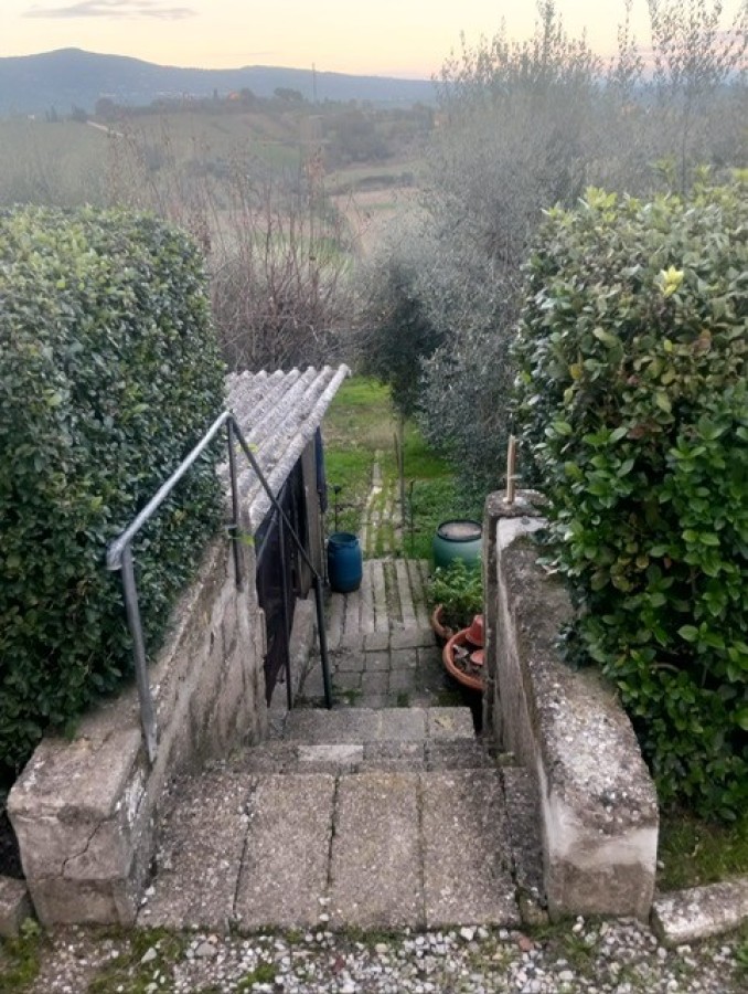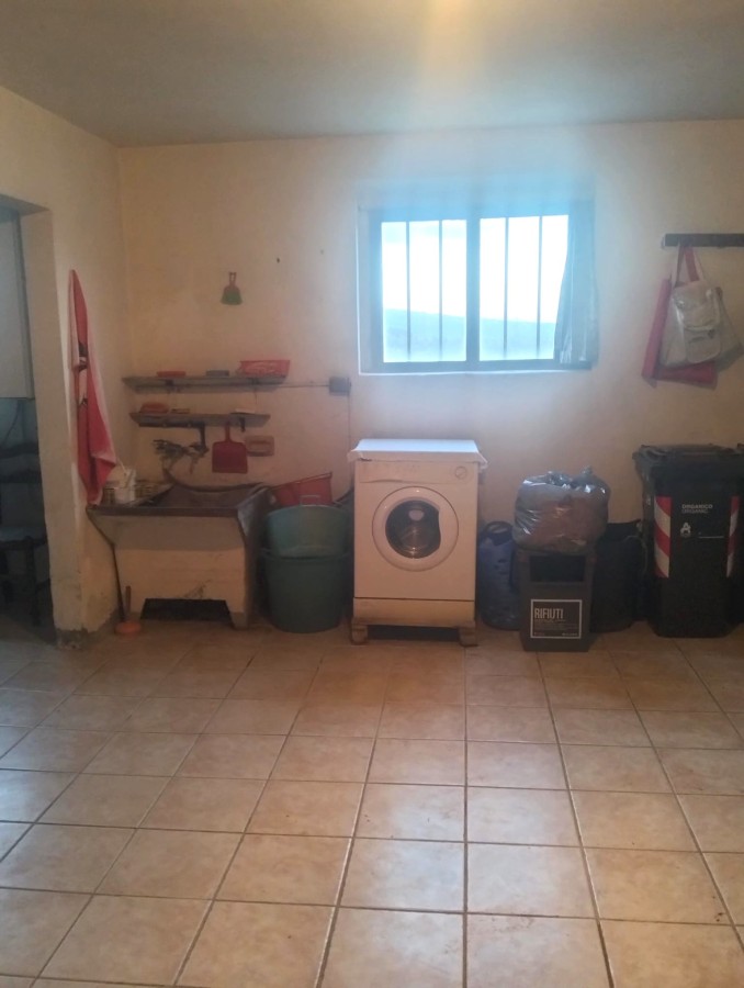 L'ingresso principale è posto al piano terra, percorrendo il giardino frontale e salendo i due scalini ci troviamo nel disimpegno, su un lato il soggiorno, dall'altro il cucinotto aperto sul tinello; disimpegno notte, due camere matrimoniali, il bagno e ripostiglio. I vani sono ampi e luminosi le metrature ed altezze sono quelle degli anni '70; scendendo la scala interna si accede direttamente nel piano seminterrato: ampio vano locale di sgombero con caldaia ed attacchi lavatrice, una seconda cucina ed il garage. Frontale all'ingresso del piano terra il giardino, laterale alla proprietà la rampa esclusiva che fa accedere sia in tutto il piano seminterrato che al terreno agricolo con olivi.