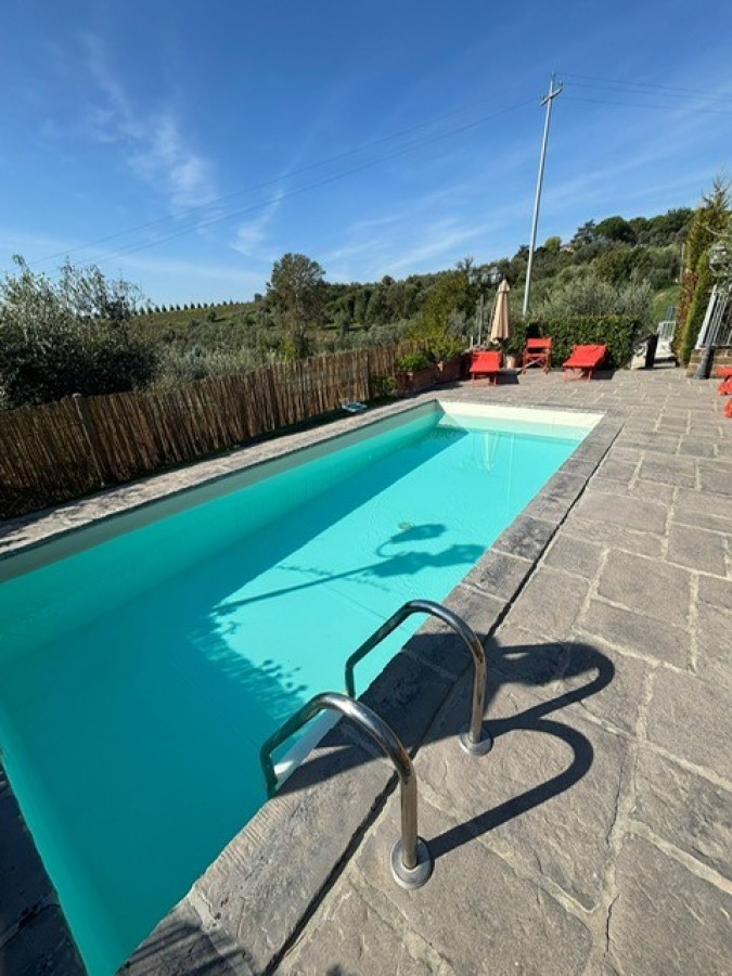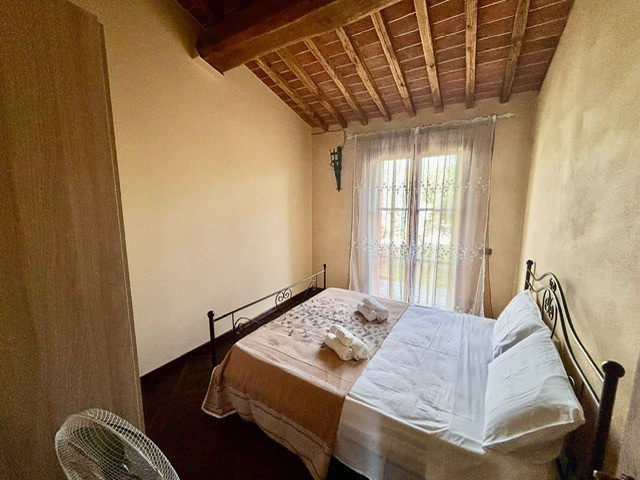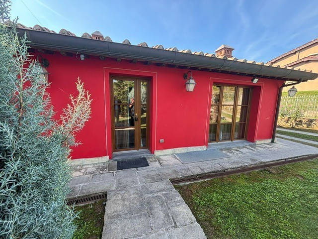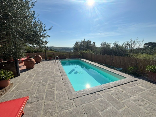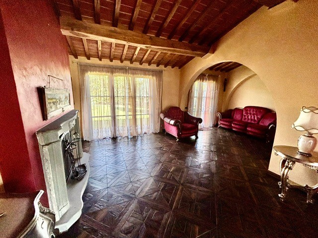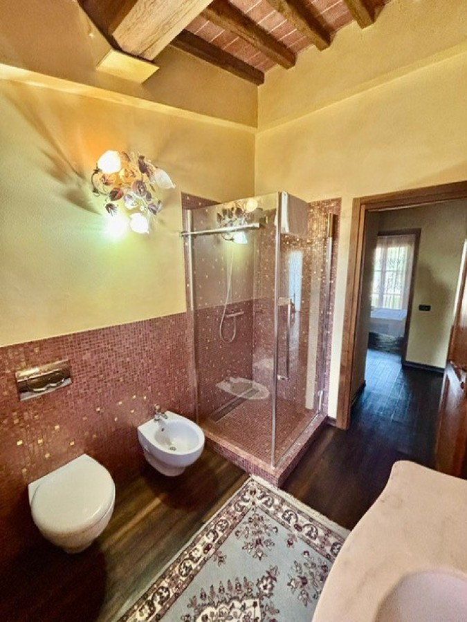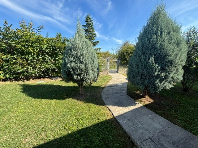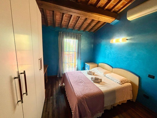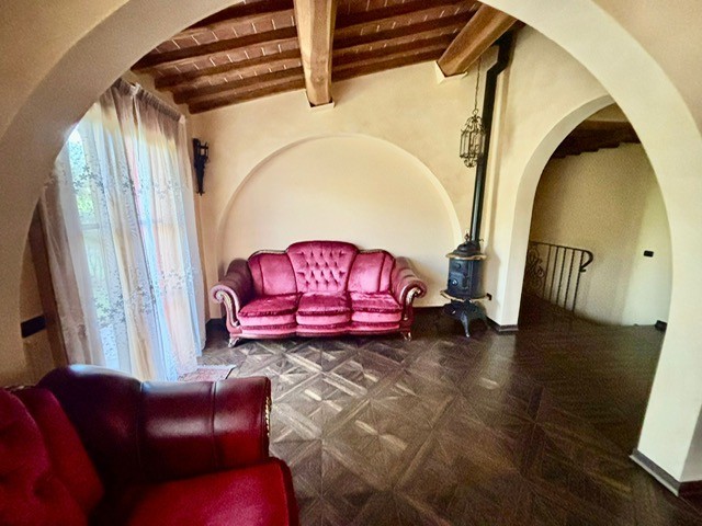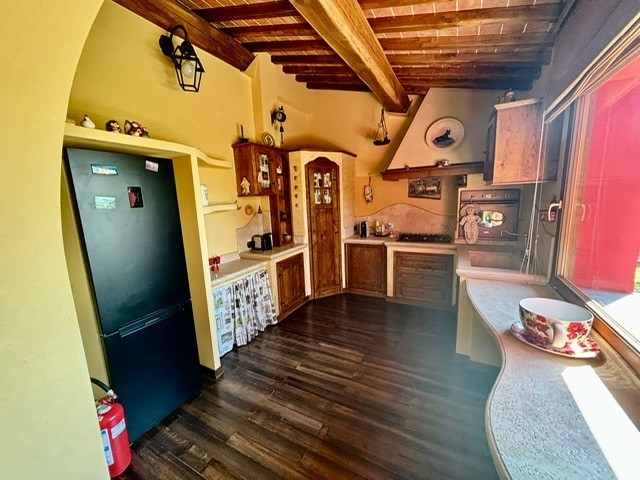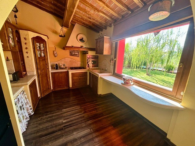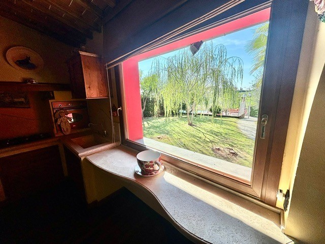 Entrando dall'ingresso principale troviamo il salone con 2 porte finestre sul giardino totalmente abitabile, cucina in muratura con uscita sul giardino, 2 camere matrimoniali, bagno. Garage. Parquet di ulivo intarsiato a pavimento, travi e mezzane a vista, doppi vetri, infissi interni ed esterni in legno. La casa è perfettamente inserita nel contesto: rustico chic con dettagli unici ed eleganti. I materiali adoperati ed i colori richiamano la natura circostante, il giardino non è solo accessorio fondamentale ma è parte della casa, tutto da vivere. La piscina rende ancora più accogliente tutto l'ambiente.