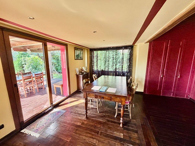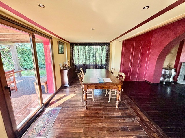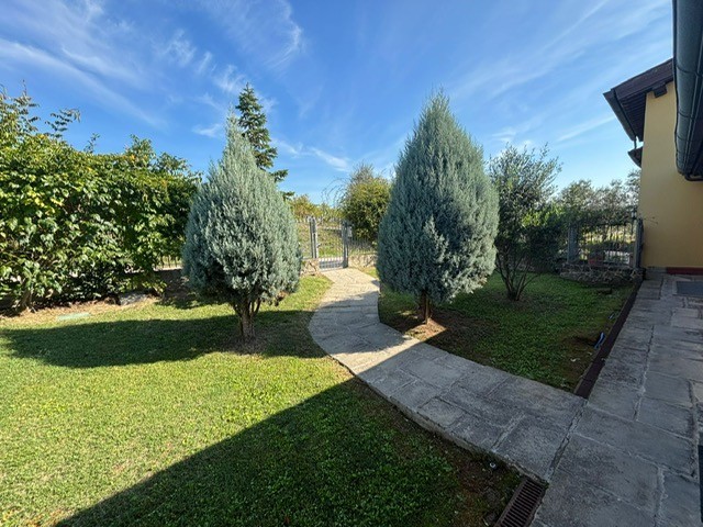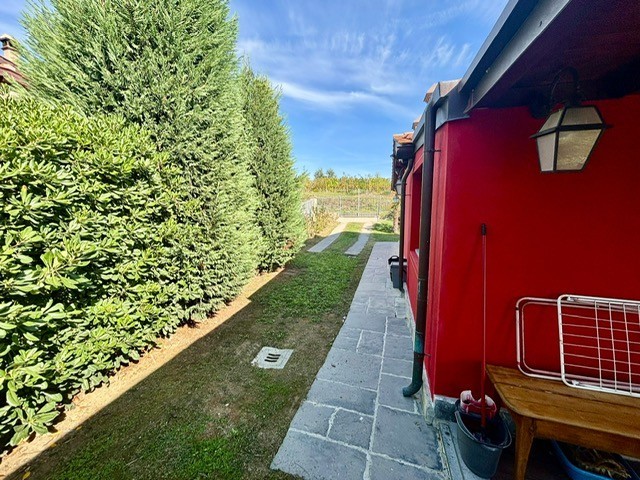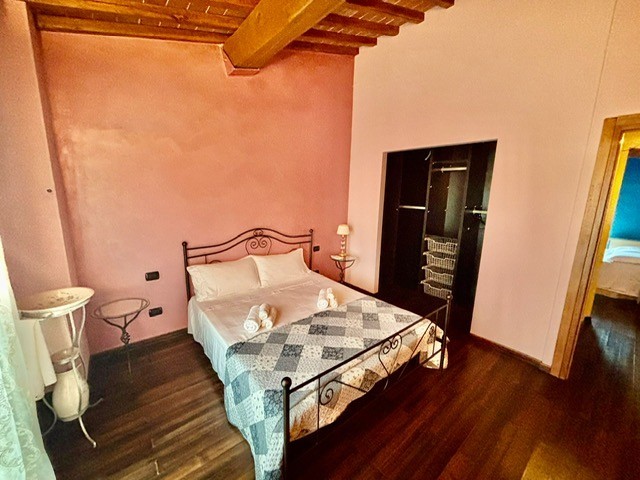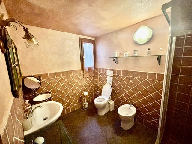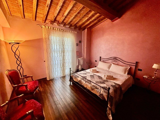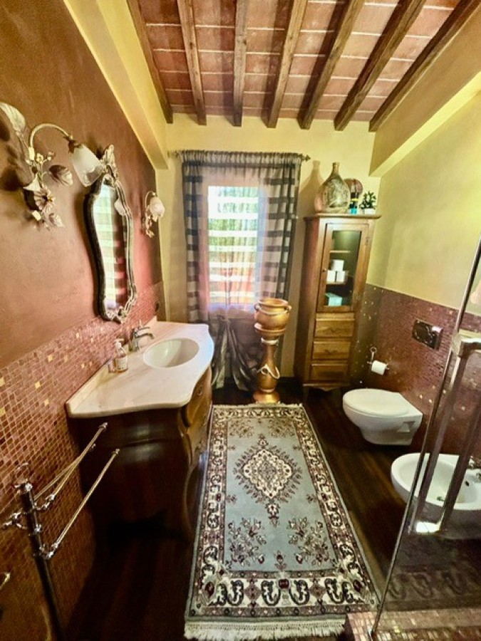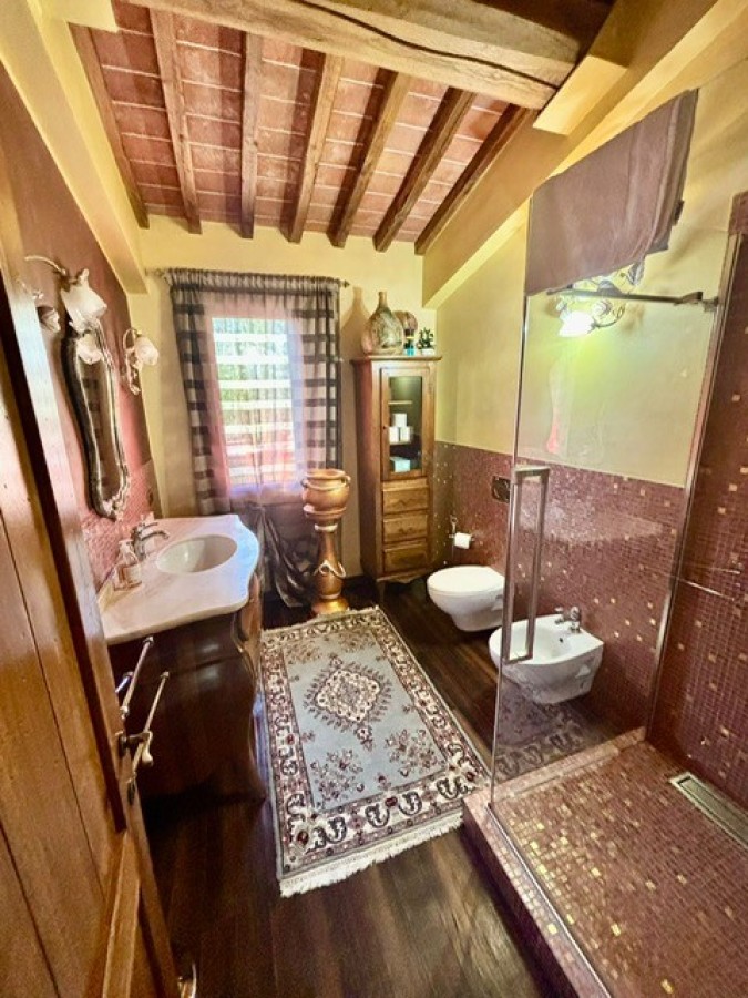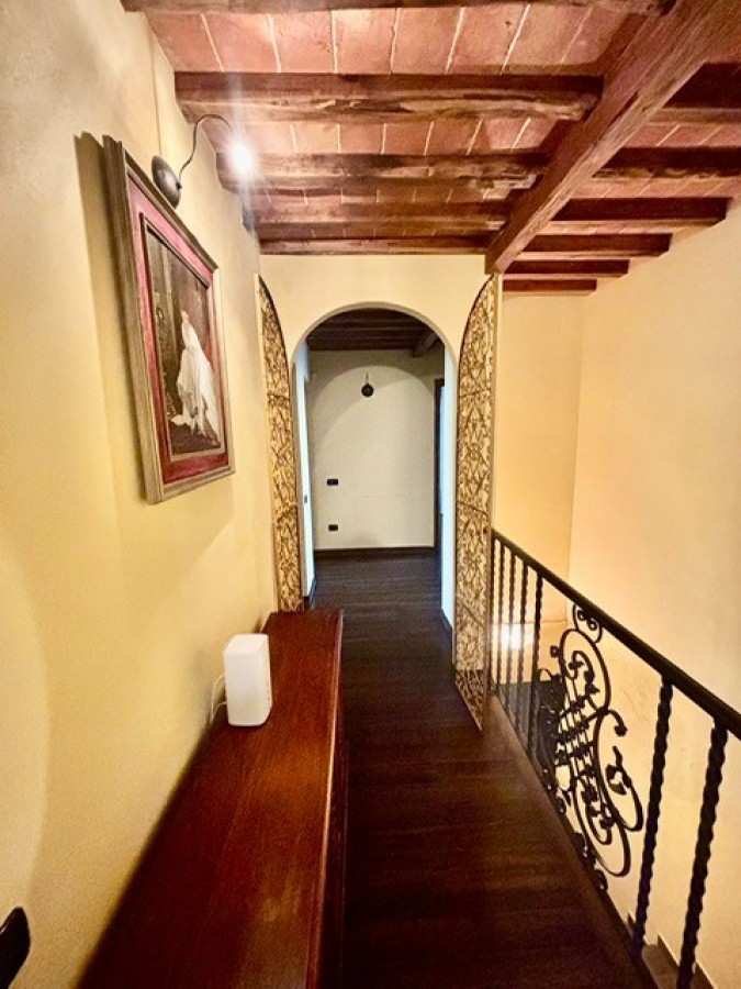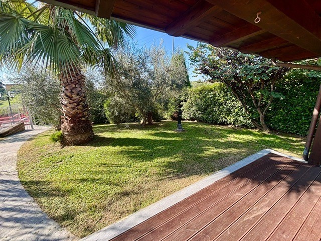 Entrando dall'ingresso principale troviamo il salone con 2 porte finestre sul giardino totalmente abitabile, cucina in muratura con uscita sul giardino, 2 camere matrimoniali, bagno. Garage. Parquet di ulivo intarsiato a pavimento, travi e mezzane a vista, doppi vetri, infissi interni ed esterni in legno. La casa è perfettamente inserita nel contesto: rustico chic con dettagli unici ed eleganti. I materiali adoperati ed i colori richiamano la natura circostante, il giardino non è solo accessorio fondamentale ma è parte della casa, tutto da vivere. La piscina rende ancora più accogliente tutto l'ambiente.