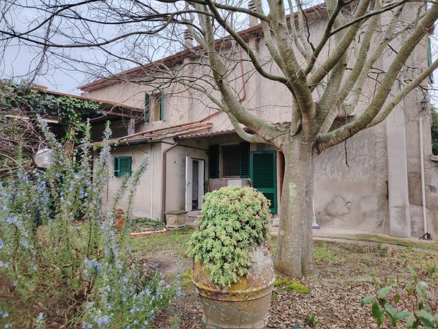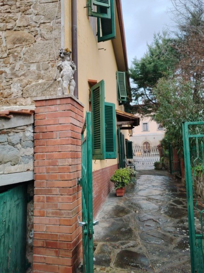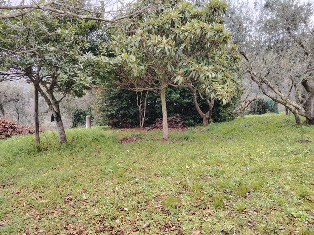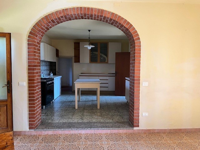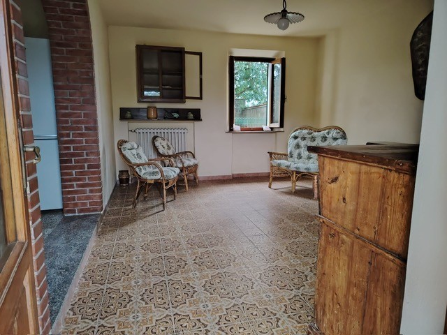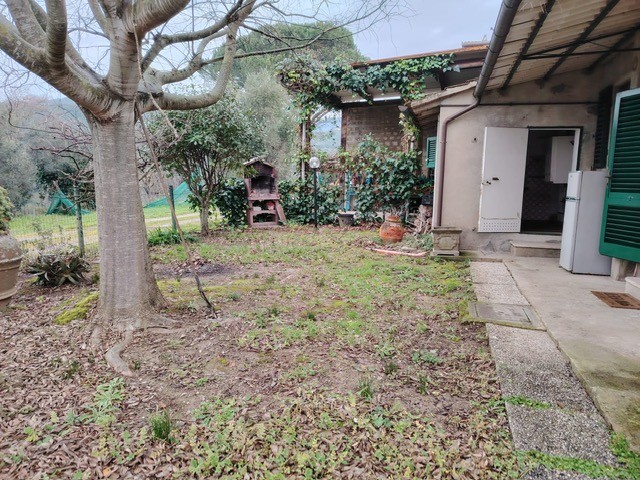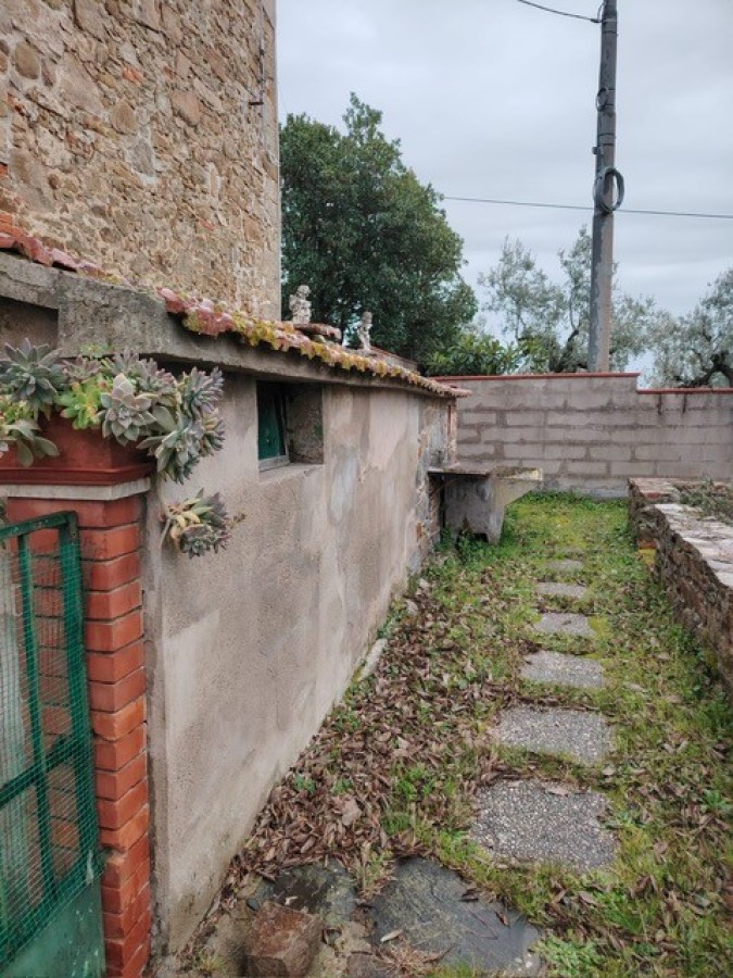 Descrizione dell'intera proprietà. Percorrendo la strada asfaltata, entrando nel borghetto ci troviamo sull'aia a comune dove è possibile parcheggiare 2 auto. L'abitazione principale di 134 mq, di tipo rurale, è disposta su due livelli terra e primo, ed è composta da un ampio soggiorno con camino aperto sulla cucina abitabile, sala da pranzo, reparto lavanderia e ripostiglio. Tutti i vani hanno la porta finestra sul giardino. Dal piano terra tramite scale in muratura si sale al primo piano dove troviamo le tre camere matrimoniali (15-16-19 mq) ed il bagno. La soffitta sovrastante è ad uso ripostiglio. Il garage è posto al piano terra su un fianco dell'immobile, mentre il terreno agricolo, attaccato al giardino, prosegue per altri 200 mq ed è coltivato ad ulivi. La tettoia attaccata alla casa è ideale per parcheggio auto e rimessaggio attrezzatura per la cura del terreno.